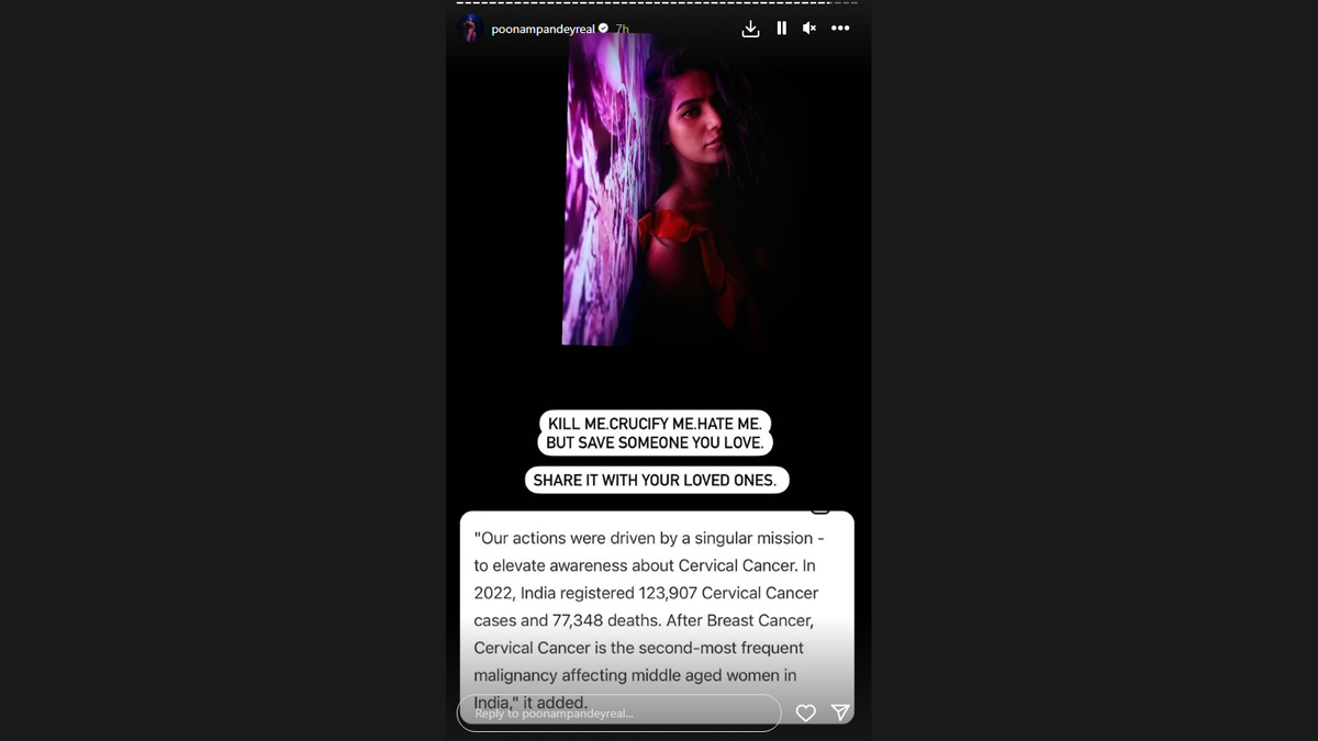 Stung by the widespread criticism of her faking her 'death' from cervical cancer, controversial model and actress Poonam Pandey stuck to her guns in her latest Instagram post that says, "Kill me, crucify me, hate me, but save someone you love." The marketing agency named Schbang, who was behind this campaign in association with Pandey, also issued an apology, saying, "Yes, we were involved in the initiative for Poonam Pandey to spread awareness about cervical cancer in collaboration with Hauterfly. Poonam Pandey Death Hoax: PR Agency Issues Apology, Claims Actress' Mother is Cancer Survivor and 'Demise' Stunt Done to Create Awareness - See Full Statement.
