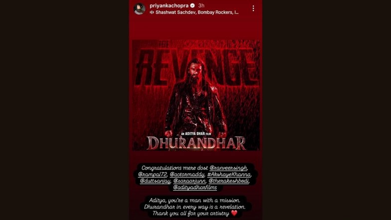 Global star Priyanka Chopra Jonas has showered praise on her “dost” Ranveer Singh, with whom she has worked in movies such as Gunday and Dil Dhadkne Do, for the blockbuster ‘Dhurandhar’, while also lauding filmmaker Aditya Dhar for his vision and artistry. Priyanka took to her Instagram stories section to extend her heartfelt congratulations to the entire team of the film. Priyanka Chopra Offers ‘Seva’ at Amritsar’s Golden Temple, Viral Video Shows ‘Varanasi’ Actress Cleaning Utensils – WATCH.
