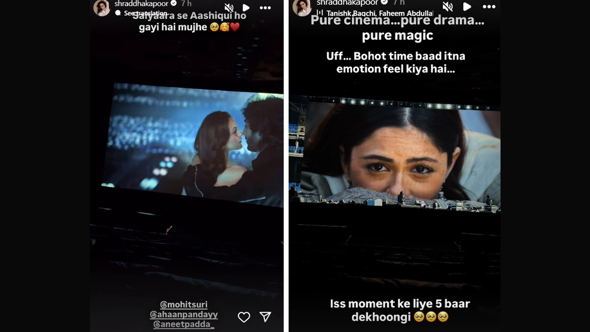 Actress Shraddha Kapoor, who watched the latest release Saiyaara, is truly smitten by the film, which she described as “pure cinema, drama and magic.” Shraddha took to Instagram stories, where she shared a video of herself watching the film in the theatre. The actress could be seen clapping and cheering for the film and its director Mohit Suri. 'Saiyaara' Box Office Verdict - Hit or Flop: 5 Lessons Bollywood Needs to Learn From Theatrical Success of Ahaan Panday-Aneet Padda's Movie