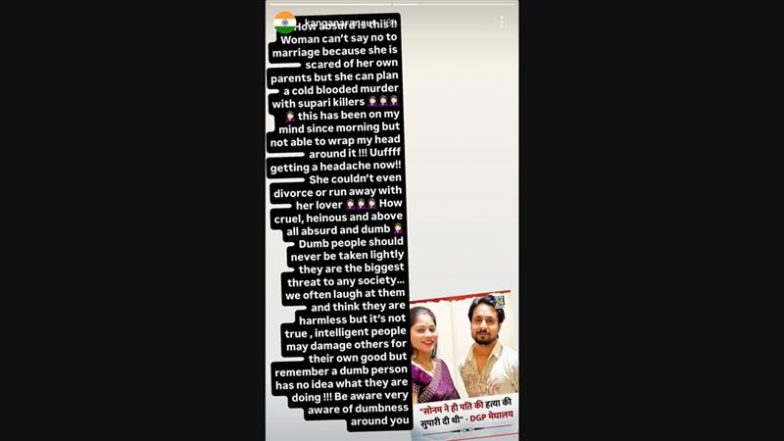 The shocking murder of a newly married man, Raja Raghuvanshi, during his honeymoon in Meghalaya has shook the nation. His wife, Sonam Raghuvanshi, along with her lover Raj Kushwaha and two other people, were behind the brutal murder. Now, reactions to the cold-blooded murder of Raja Raghuvanshi have taken over social media. Even celebrities have expressed their anger and sorrow over his passing. BJP MP and Bollywood actress Kangana Ranaut also reacted to the incident through a strong post on social media and slammed Sonam Raghuvanshi for her inhumane actions. 'Justice for Raja Raghuvanshi' Shrasti Raghuwanshi, Sister of Murdered Indore Man, Shares Instagram Reels and Videos Demanding Justice for Her Brother.