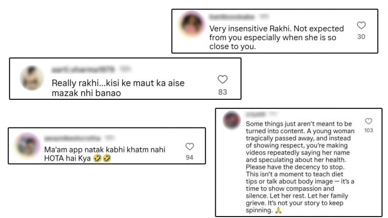 A user wrote, "Let her rest. Let her family grieve. It's not your story to keep spinning", while another user commented, "Very insensitive, Rakhi. Not expected from you, especially when she is close to you." Shefali Jariwala Death Probe: Actress Consumed Anti-Ageing Tablets on Empty Stomach, Resulting in Low Blood Pressure That Led to Her Death, Says Mumbai Police.