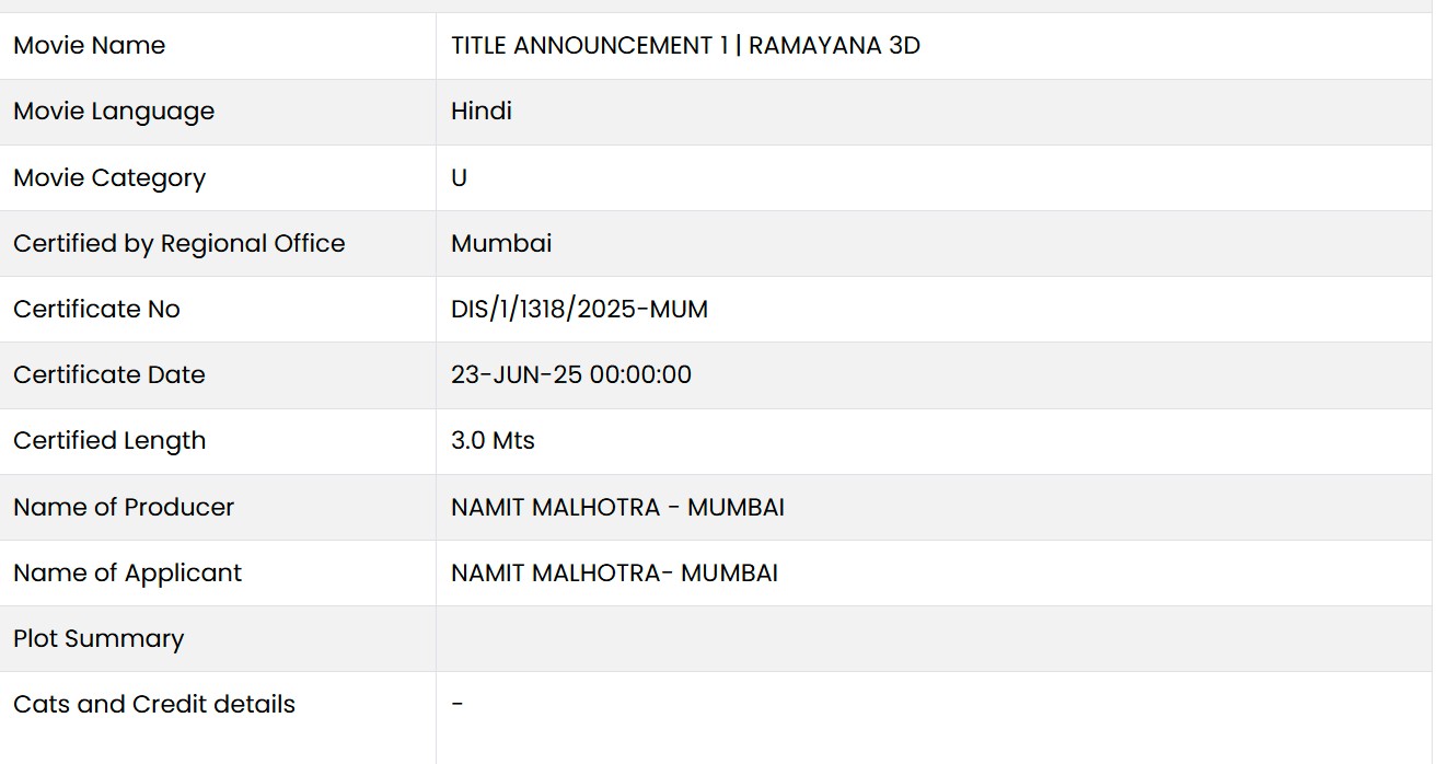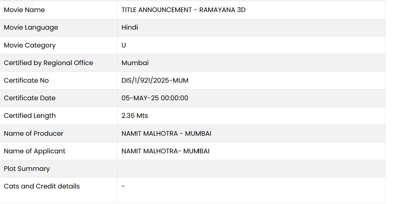 According to the CBFC website, a title announcement video was recently submitted and certified on June 23, 2025. The teaser is listed as being three minutes long. Interestingly, the film's title has been submitted as Ramayana 3D.