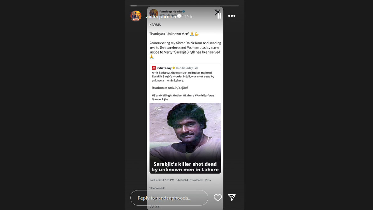 After learning about the Late Sarabjit Singh’s killer gunned down in Pakistan, actor Randeep Hooda, who played his role in the 2016 biographical drama Sarbjit, said that karma does catch up, even if through unknown men. In what's being considered an incident of targeted killing, unidentified gunmen on Sunday killed Amir Tanba, a key figure behind the killing of Sarabjit Singh in Lahore's Kot Lakhpat Jail in 2013. Amir Tanba was outside his residence at Islampura in Lahore when two unidentified motorcycle-borne gunmen opened fire, injuring him critically. The killing of Amir Tanba is seen as a "revenge killing" done by hired killers. Randeep Hooda Recalls Being ‘Depressed’ After Having No Job for 11 Years, Swatantrya Veer Savarkar Actor Says, ‘I Had To Sell-Off Everything’.