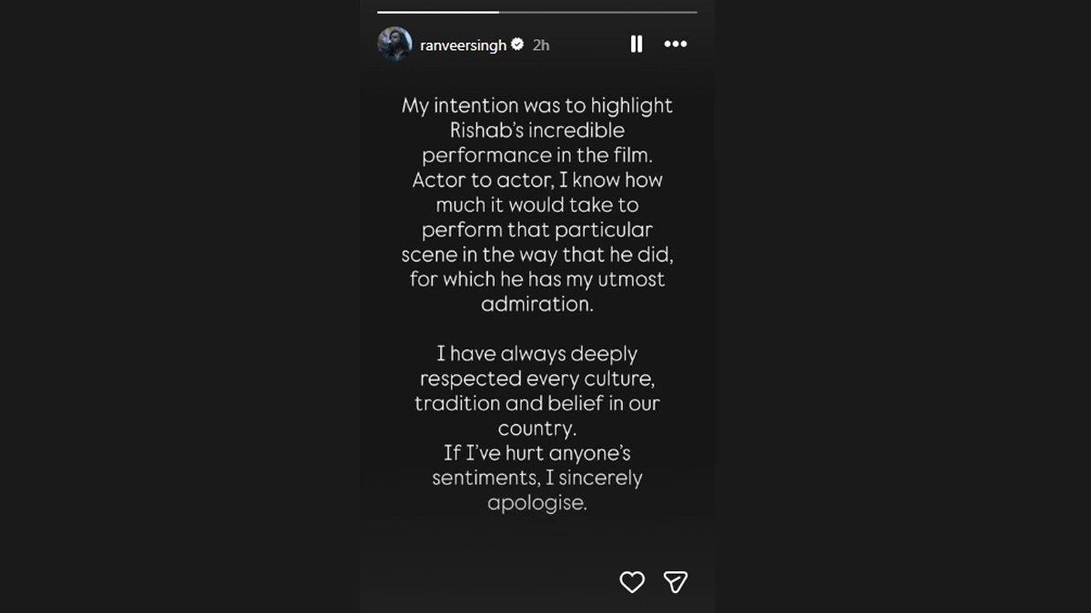 Ranveer wrote on his Instagram Stories, "My intention was to highlight Rishabh's incredible performance in the film. Actor to actor, I know how much it would take to perform that particular scene in the way that he did, for which he has my utmost admiration. (sic)."