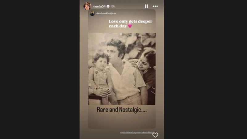 Mumbai, July 23: Actress Neetu Kapoor often uses social media to remember her late actor husband, Rishi Kapoor. Going down the memory lane once again, she took to the stories section of her Instagram and treated her InstaFam with a throwback photo of Rishi Ji and baby Riddhima Kapoor. The still showed Rishi Ji kissing Riddhima on the head, while Neetu adorably looked at the father and daughter duo. “Rare and nostalgic", Neetu captioned the post.