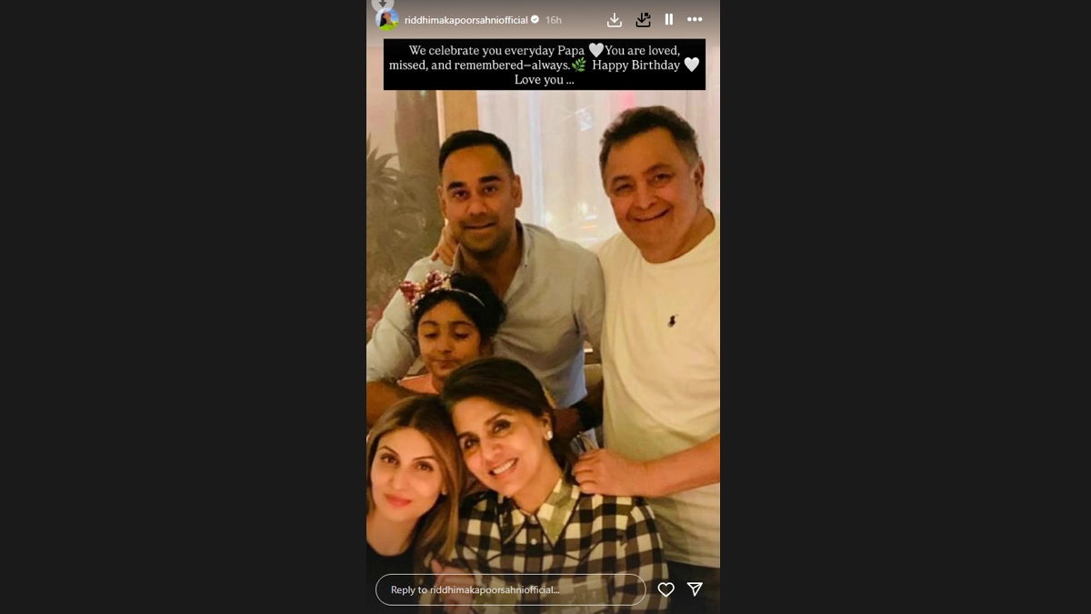 Kapoor shared video footage from an event, "Khullam Khulla – Live with Rishi Kapoor, that featured his brother Randhir Kapor, son Ranbir Kapoor, daughter Riddhima Kapoor Sahni, sister Reema Jain, filmmaker Ramesh Sippy and veteran actor Jeetendra. She captioned it as, “You will always remain in our hearts… happy birthday.”