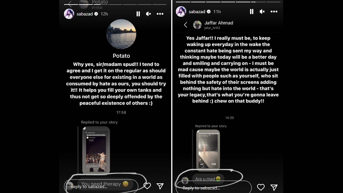 Amid the constant barrage of negative comments, Saba Azad decided to take a stand and respond to the trolls. On October 12, 2023, she shared a screenshot of a message she received from a netizen who remarked, "You need therapy (laughing face emoji)." Unfazed by the comment, Saba delivered a dignified response: