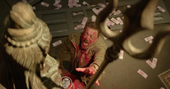 The immediate next scene sees him stabbing Yogesh with the trishul.