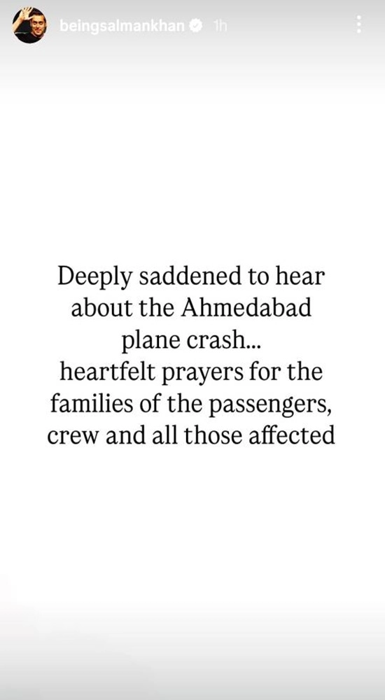 Mumbai, June 12: Actor Salman Khan used social media to share his heartfelt prayers for all those affected in the Air India plane crash on Thursday. Khan took to his Instagram stories and penned, “Deeply saddened to hear about the Ahmedabad plane crash…Heartfelt prayers for the families of the passengers, crew and all those affected." Moreover, amidst the unfortunate incident, the 'Sultan' actor decided to cancel his press conference as the new face of the Indian Supercross Racing League (ISRL). Khan was scheduled to attend a press conference in Mumbai on Thursday, with ISRL's co-founders, Veer Patel and Ishan Lokhande.