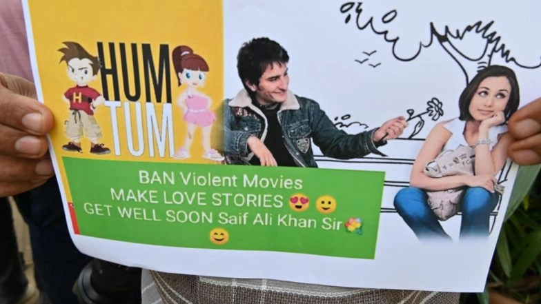 Saif Ali Khan has been all over the news since the morning after he was attacked at his Mumbai home during a robbery attempt. During the scuffle with the intruder, the Bollywood actor was reportedly stabbed six times, two of which were deep cuts. He was immediately rushed to the Lilavati Hospital, where he underwent a minor surgery. Doctors have now confirmed that he is out of danger and is currently recovering. Among the several celebrities visiting Saif at the hospital, a female fan reached the place with a placard in her hand featuring the poster of his film Ta Ra Rum Pum (2007) and demanded Bollywood filmmakers stop making violent films. Saif Ali Khan Stabbing Case: Actor’s Team Confirms He’s Out of Danger and Recovering After Surgery.