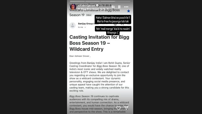 The mail was sent by Rohit Gupta, Senior Casting Coordinator for Bigg Boss season 19, offering Ashneer to feature as a wildcard contestant on the show. It read, “We are delighted to contact you regarding an exclusive opportunity to join the show as a wildcard contestant. Your dynamic personality, engaging social media presence, and unique appeal have caught the attention of our casting team, making you a strong candidate for this exciting role. Bigg Boss season 19 continues to captivate audiences with its compelling mix of drama, entertainment, and human connection. As a wildcard contestant, you would have the chance to enter the Bigg Boss house mid-season, bringing fresh energy and perspective to the show”.