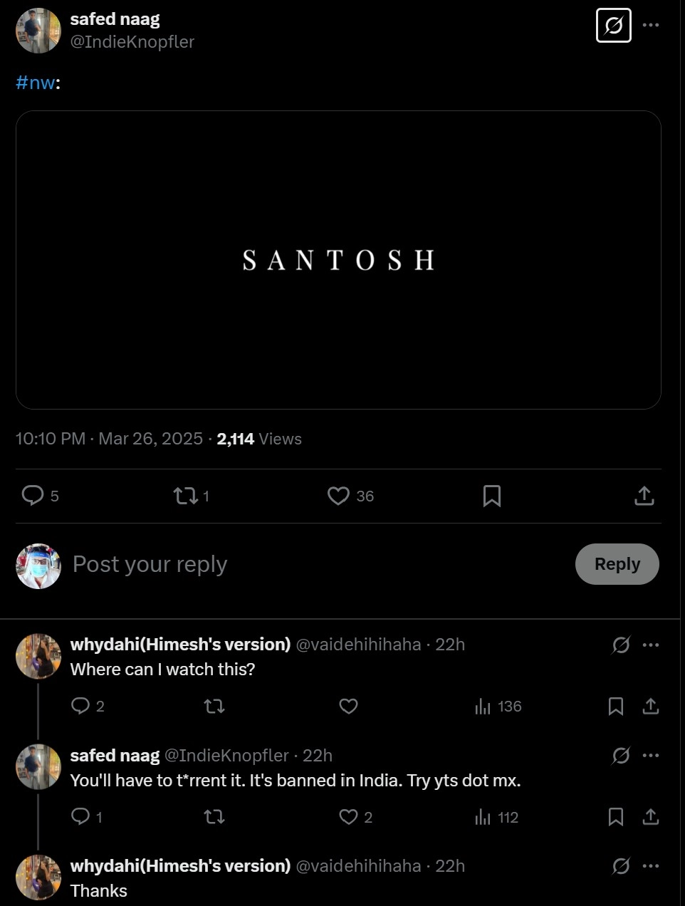 Santosh is not even the most radical film you'll see, just surface level portrayal of police brutality, casteism, while having the same gaze films like Article 15 have and yet it's been banned in India is how bad censorship is here