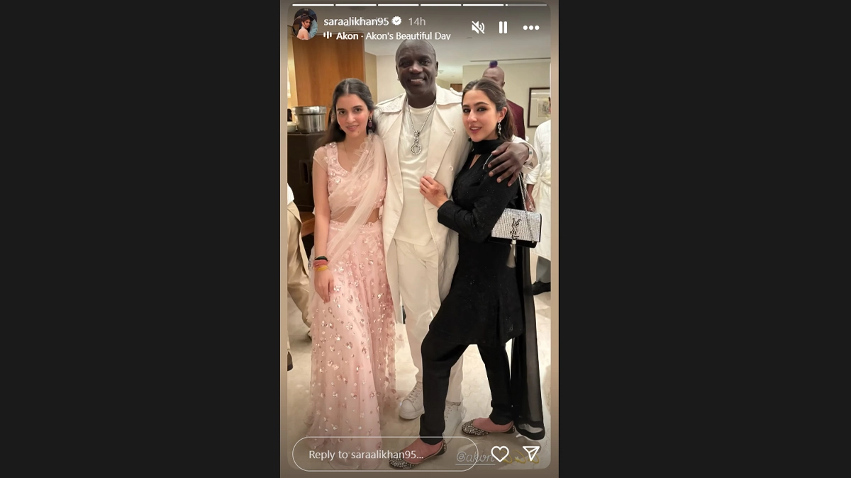 Bollywood actress Sara Ali Khan had a fan moment as she met American singer Akon and posed with him for pictures at a wedding. Sara took to her Instagram stories in the early hours of Monday morning, where she posted the picture. In the image, the actress flaunted her “desi girl” side dressed in a black Indian wear. She is seen hugging Akon, who looks dapper in white, from the side. The two are joined by the actress’ friend in the picture. Sara Ali Khan at Hockey India League Grand Finale: Crowd Cheers As ‘Sky Force’ Actress Dances to ‘Chaka Chak’ at Birsa Munda Stadium in Rourkela (See Pics and Video)