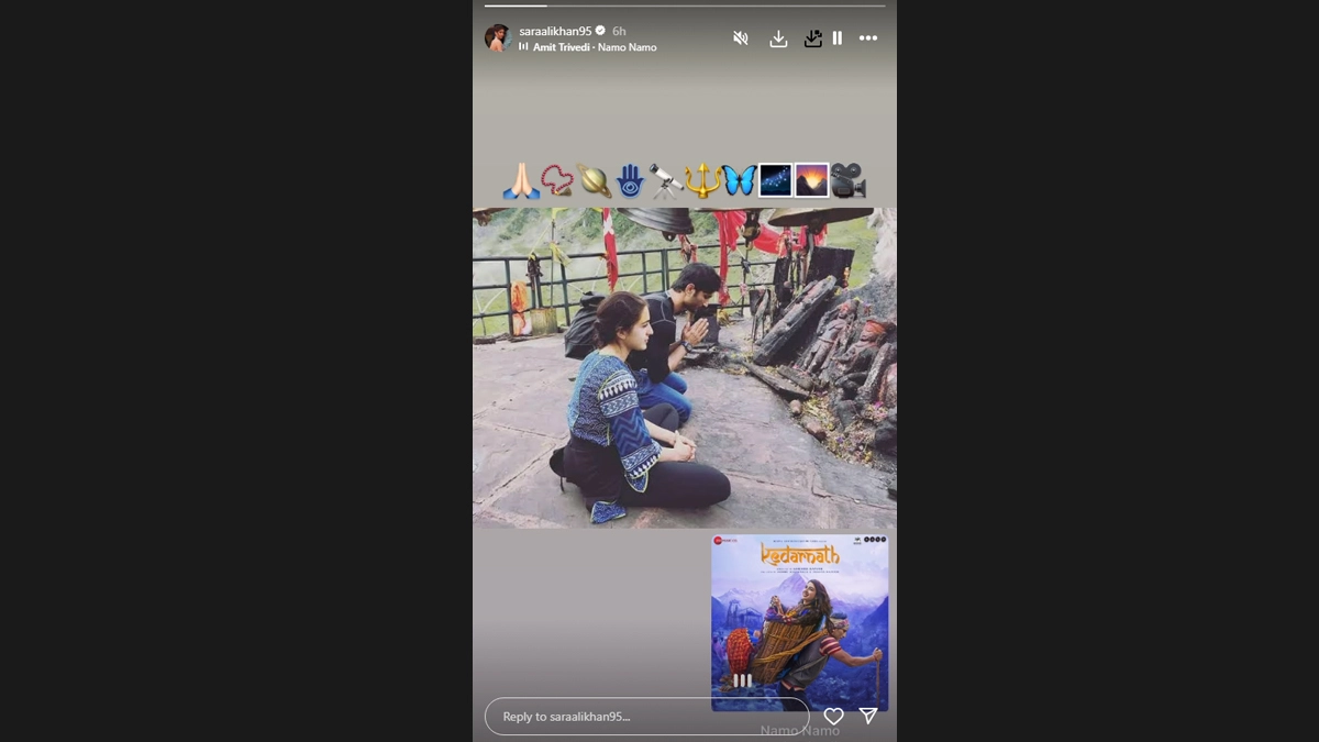 The actress took to the Stories section of her Instagram and shared a throwback picture with Sushant, her co-star in Kedarnath (2018). In the picture, Sushant can be seen praying to god with folded hands, with Sara seated next to him. The actress did not write anything on the picture but added the song "Namo Namo" from Kedarnath.