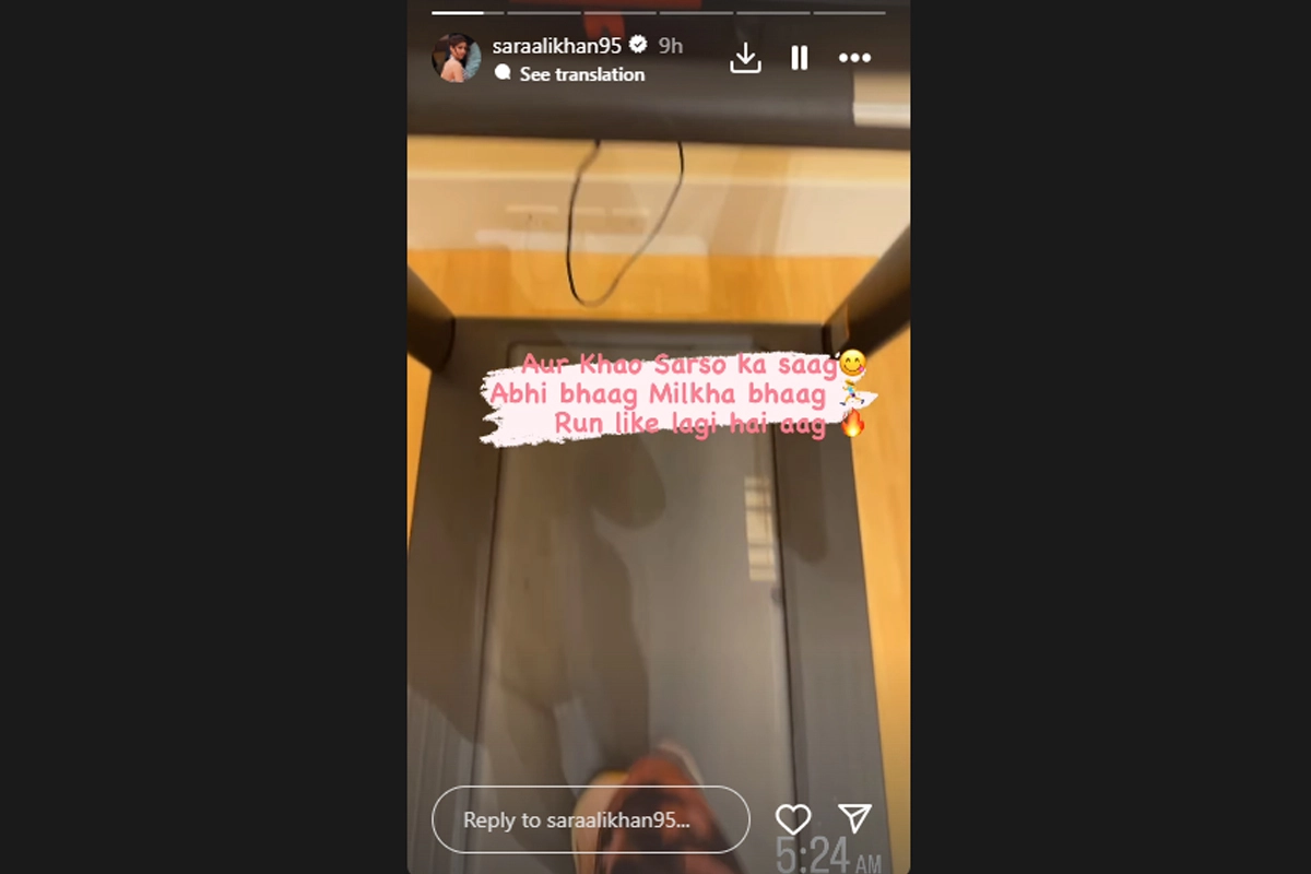 Actress Sara Ali Khan has given a sneak peek into what it takes for her to burn those extra calories--with a spin of poetry. Sara took to her Instagram stories, where she shared a string of videos from her gym day. The first clip had the Simmba actress running on the treadmill and wrote: “Aur Khao sarso ka saag abhi bhaag Milkha bhaag. Run like lagi hai aag.” Sara Ali Khan Shares 'Sunday Thoughts' via Her Book; No Battle of Life Lies Outside.