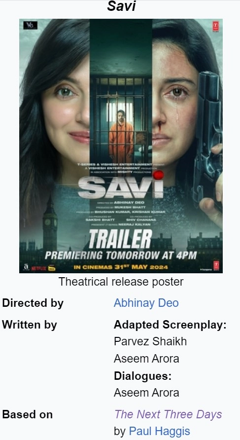 First, The Next Three Days is itself a remake of the 2008 French film Pour Elle. Secondly, Savi is a gender-swapped remake of the American film directed by Paul Haggis.