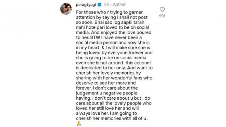 He wrote, "For those who r trying to garner attention by saying I shall not post so soon. Bhai sab log aapki tarah nahi hote.pari loved to be on social media. And enjoyed the love poured to her. BTW I have never been a social media person and now she is in my heart, & I will make sure she is being loved by everyone forever and she is going to be on social media even she is not around. this account is dedicated to her only."