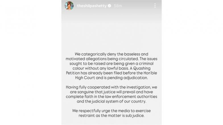 She continued, "Having fully cooperated with the investigation, we are sanguine that justice will prevail and have complete faith in the law enforcement authorities and the judicial system of the country. We respectfully urge the media to exercise restraint as the matter is sub judice." ‘Bigg Boss’ Fame Satya Naidu Caught in Late-Night Brawl at Shilpa Shetty’s Bengaluru Restaurant Bastian; Viral Video Sparks Police Probe and Online Outrage (Watch).