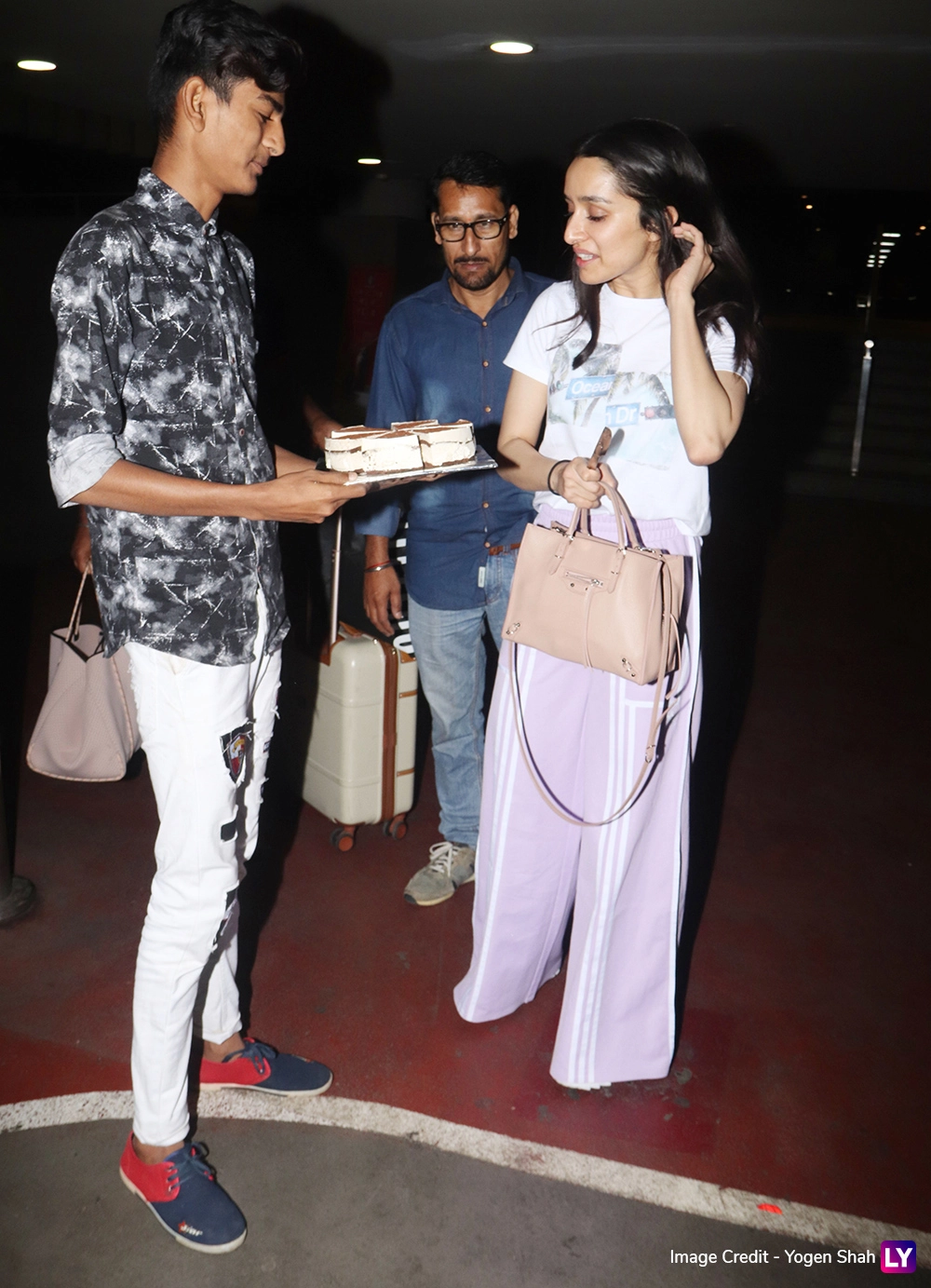 The star wore a simple white tee, paired with mauve palazzos. She had that trendy no-makeup look and left her hair loose. This appearance at the airport turned into an event when a fan surprised her with a cake.