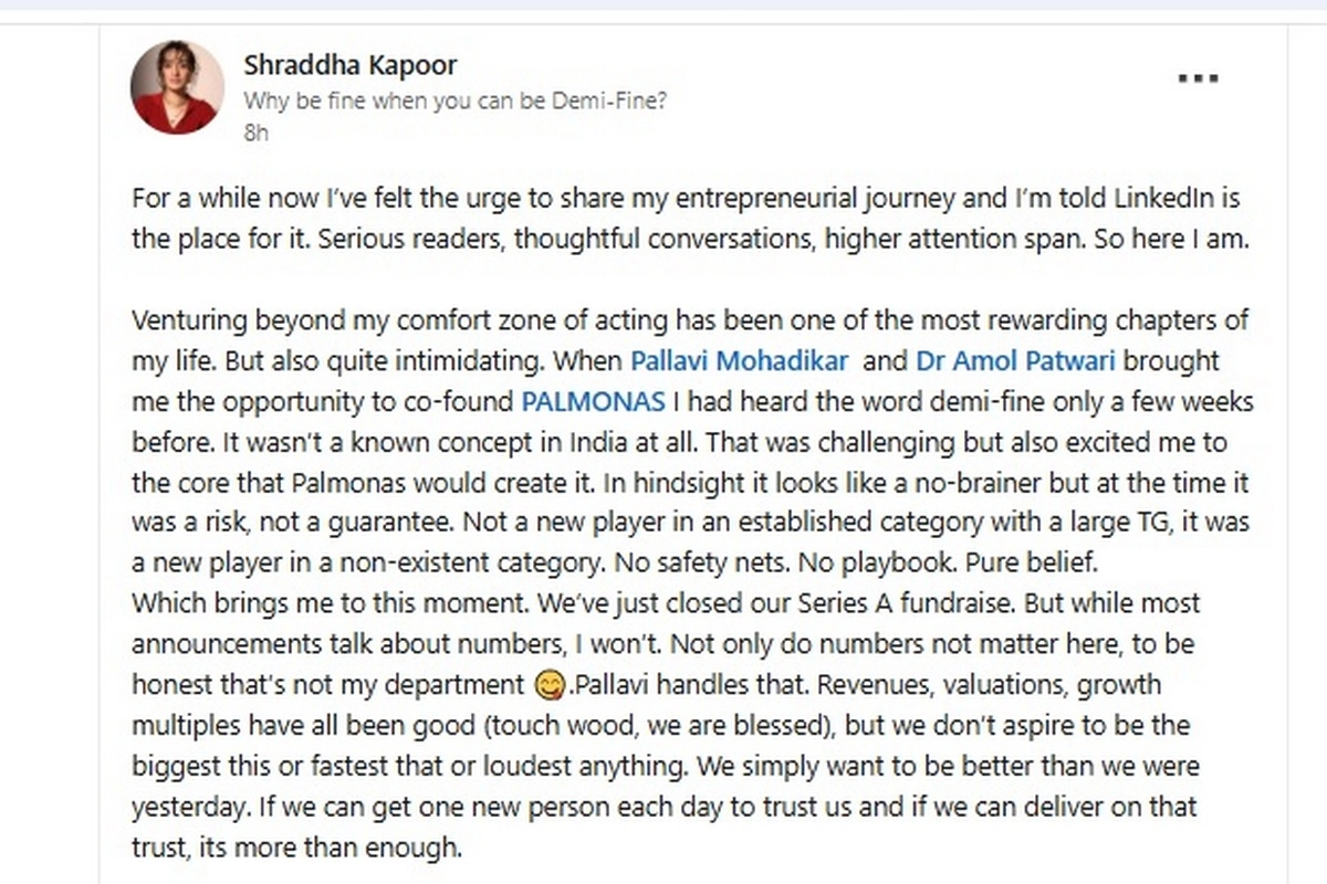 Part of Shraddha Kapoor's LinkedIn Post (Photo Credit: LinkedIn)