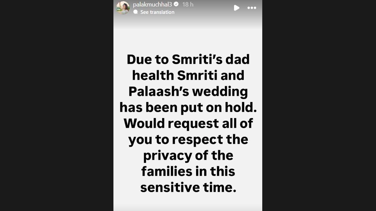 Playback singer Palak Muchhal has spoken out after the sudden postponement of her brother Palash Muchhal’s wedding to Indian cricketer Smriti Mandhana. Taking to Instagram, Palak wrote, “Due to Smriti’s father’s health, Smriti and Palash’s wedding has been put on hold. We would request all of you to respect the privacy of the families during this sensitive time". The wedding, which was scheduled for Sunday, was cancelled after Smriti’s father, Mr. Shriniwas Mandhana, was hospitalised due to heart-related symptoms. Palash too was briefly admitted for a viral infection but has since been discharged. Following the announcement, Smriti deleted all wedding-related posts, including the proposal and announcement videos, from her social media accounts. Her teammates Jemimah Rodrigues and Shreyanka Patil also removed related posts. Both families have confirmed that Mr. Mandhana’s condition is stable and under medical supervision. Smriti Mandhana Marriage Date: When Is Team India Women’s Cricket Star Getting Married To Palash Muchhal?