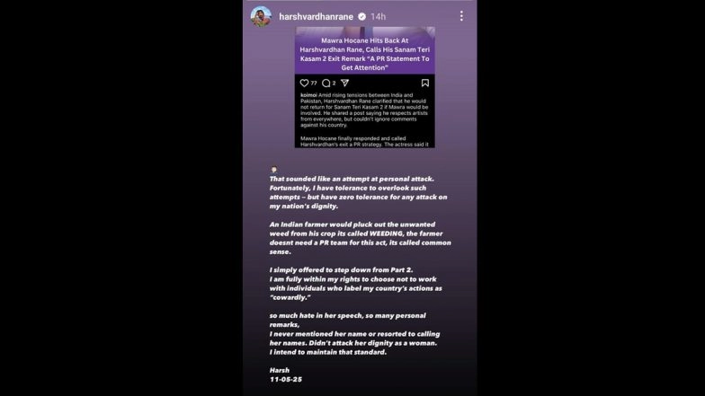 The actor took to the Stories section of his Instagram, and wrote, “That sounded like an attempt at personal attack. Fortunately, I have tolerance to overlook such attempts - but have zero tolerance for any attack on my nation's dignity. An Indian farmer would pluck out the unwanted weed from his crop, it's called WEEDING, the farmer doesn't need a PR team for this act, it’s called common sense (sic)”. Is Mawra Hocane Part of ‘Sanam Teri Kasam 2’? Pakistani Actress Would Love To Return in Fan Favourite Romantic Drama’s Sequel, but….