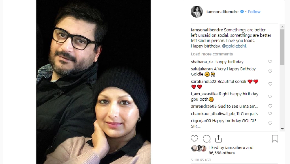 Sonali Bendre is back in India after her long treatment for cancer in the US. The actress has become our daily dose of sunshine over the past few weeks. And here she is at it again. The Sarfarosh actress posted a cute selfie with her hubby Goldie Behl on his birthday, on Instagram. The caption of the post is a lesson in love itself. Love bugs, read carefully. While wishing her hubby, Sonali wrote in the post, "Somethings are better left unsaid on social, somethings are better left said in person. Love you loads."