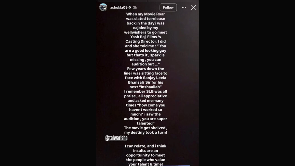 He described the entire incident via a note that read: "When my movie Roar was slated to release back in the day i was cajoled by my well-wishers to go meet Yash Raj Films' casting director. I did and she told me: 'You are a good looking guy but that's it, spark is missing, you can audition but...(sic)'"