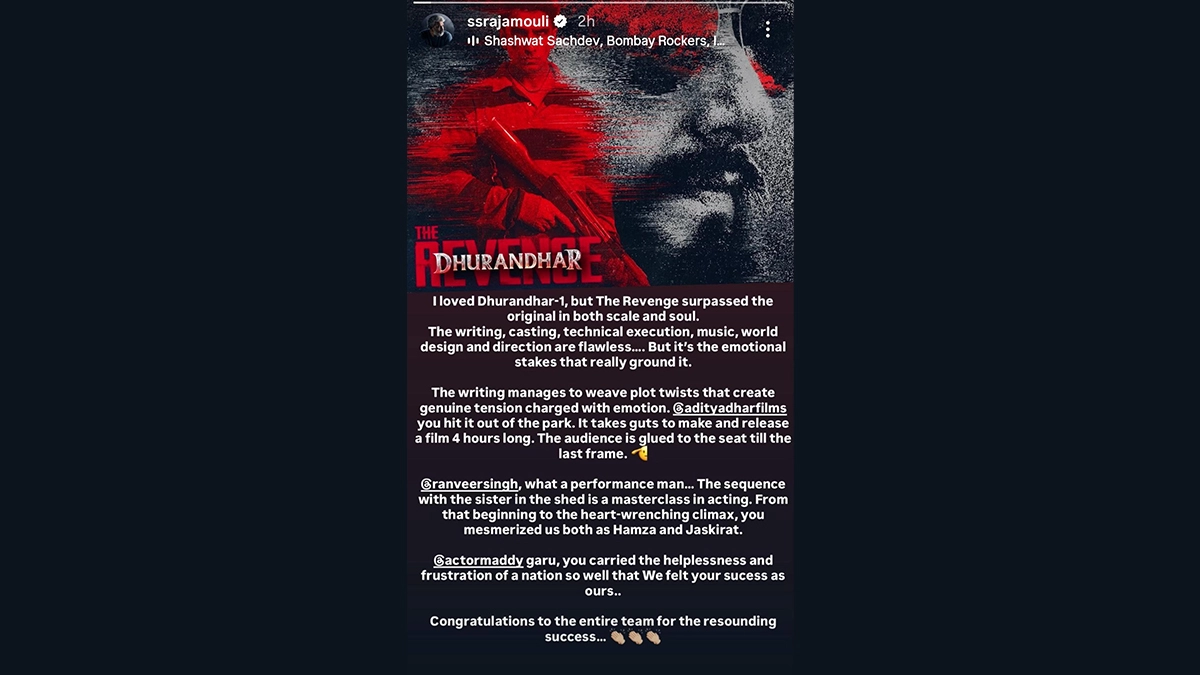 He said, “I loved Dhurandhar-1, but The Revenge surpassed the original in both scale and soul.” He added, “The writing, casting, technical execution, music, world design and direction are flawless…. But it’s the emotional stakes that really ground it.” The Baahubali director further added, “The writing manages to weave plot twists that create genuine tension charged with emotion. @AdityaDharFilms, you hit it out of the park. It takes guts to make and release a film 4 hours long. The audience is glued to the seat till the last frame.”