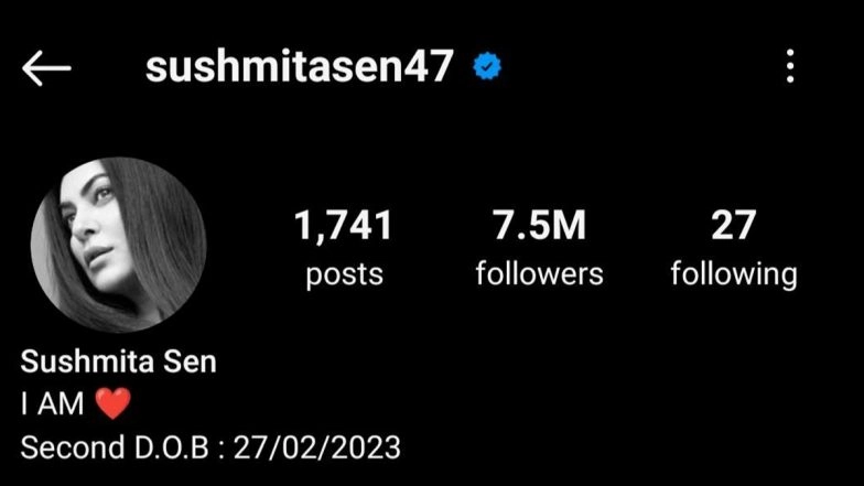 Taking a look at Sushmita Sen's Instagram bio will surely grab your attention, leaving you confused. Her latest Instagram bio reads, "Second D.O.B: 27/02/2023." This sudden move by the actress has left her fans surprised and curious about the significance of the date. To clarify, in February of last year, the actress suffered a heart attack on the set of her web series, Aarya Season 3. She later underwent surgery and maintained a low profile. In March, Sushmita shared the news with her fans. Having fought through this difficult time, the date holds great importance to her, which is why she has included it in her bio. Sushmita Sen THANKS Aarya 3 Cast and Her Fans As She Poses With Her Dadasaheb Phalke Award, Says ‘You Guys Are My Lifetime’ (View Pics).