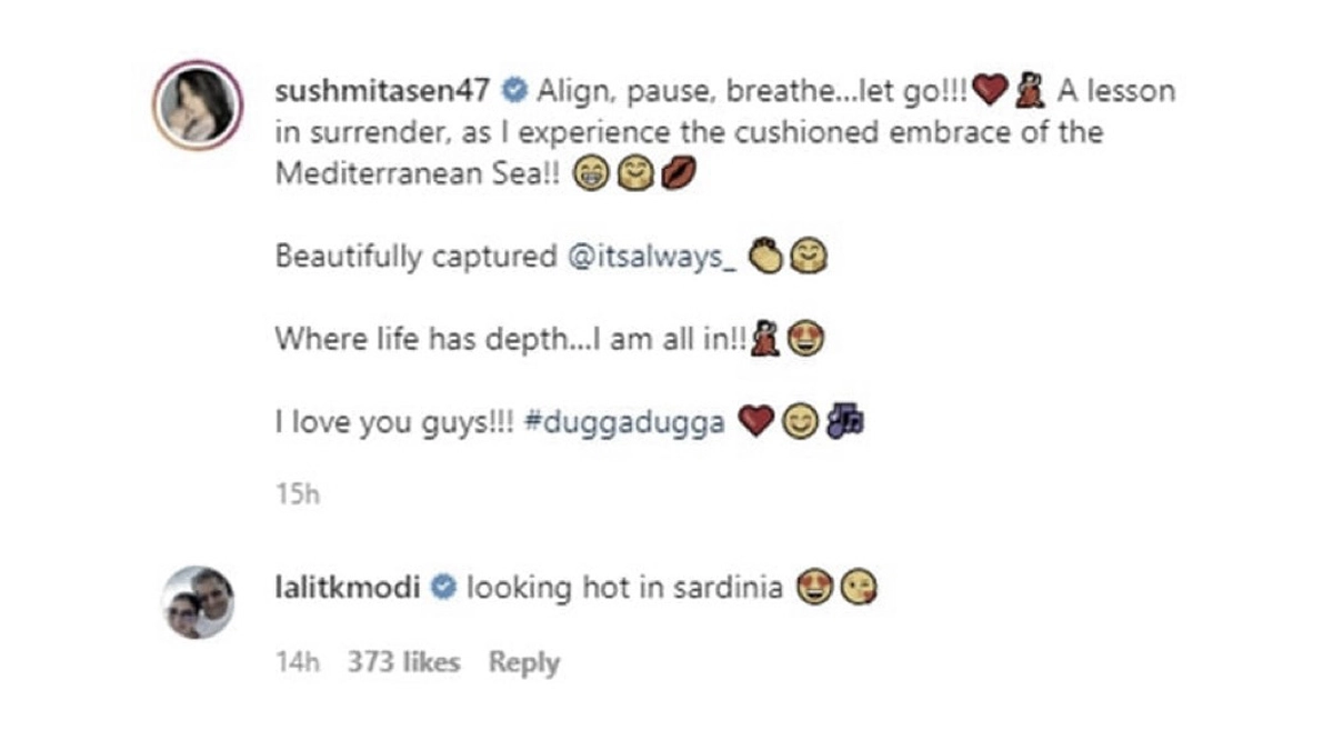 Sushmita's beau and former Indian Premiere League (IPL) chairman Lalit Modi could not stop himself from complimenting his lady love. "Looking hot in Sardinia," he wrote. Sushmita Sen And Lalit Modi Dating: Ranveer Singh Reacts To Ex-IPL Chairman’s Announcement About His Relationship With The Former Miss Universe.