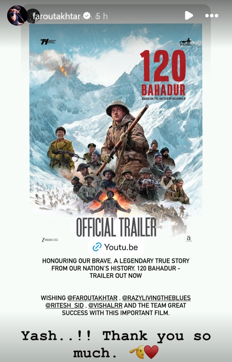 The trailer has been met with overwhelming praise across social media. South superstar Yash, who launched the trailer, shared his admiration for the film, posting,Ā āHonouring our brave, a legendary true story from our nationās history. 120 Bahadur ā trailer out now.Ā Wishing @FarOutAkhtar, @RazyLivingTheBlues, @RiteshSid, @VishalRR and the team great success with this important film.ā