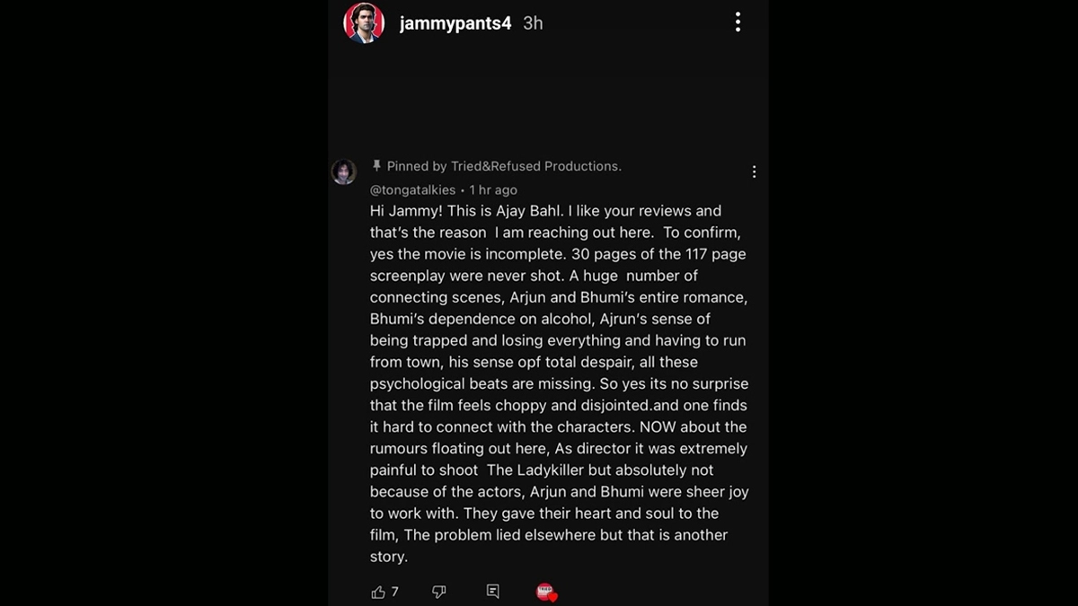 Now about the rumours floating out here, as director, it was extremely painful to shoot The Lady Killer, but absolutely not because of the actors. "Arjun and Bhumi were sheer joys to work with. They gave their heart and soul to the film. The problem lied elsewhere, but that is another story," Ajay wrote in the comments.
