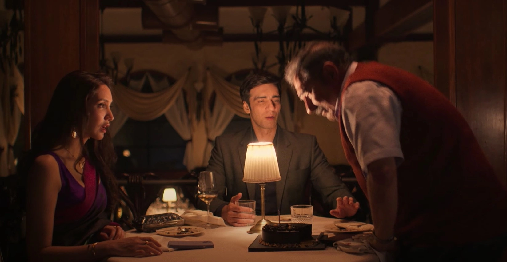 Boman Irani also has a knack for pulling off dramatic scenes and eliciting strong performances from his cast. Take, for instance, the first airport scene, where Anu vents her frustration at Shiv and Amay, with Puja Sarup delivering a standout performance. Or the candlelit dinner scene between father and son, which takes an unexpectedly aggressive turn. These moments showcase Irani’s skill in staging emotionally charged sequences, while allowing Irani and Tiwary to showcase their histrionics in an appreciable manner.