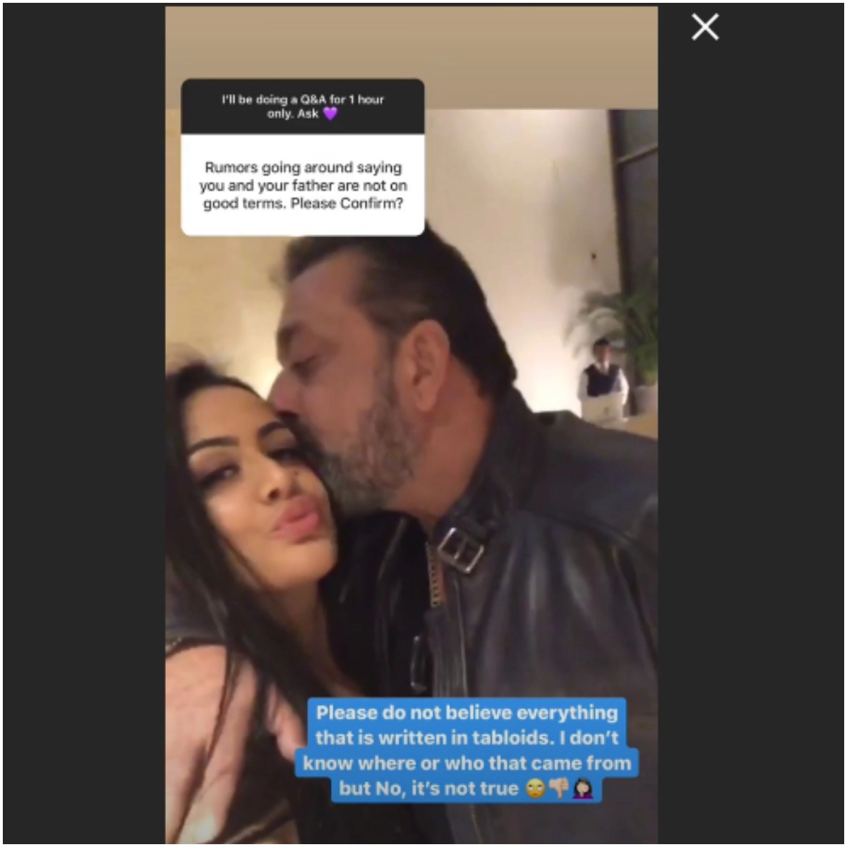 Trishala once again conducted an Ask Me Anything session for an hour on Instagram. A fan posed her the question on the ongoing rumours about her equation with her father. Trishala Dutt was asked, “Rumors going around saying you and your father are not on good terms. Please Confirm?” To this the young lady replied, “Please do not believe everything that is written in tabloids. I don’t know where or who that came from but No, it’s not true.” This has pretty much cleared the air on the speculations doing rounds.