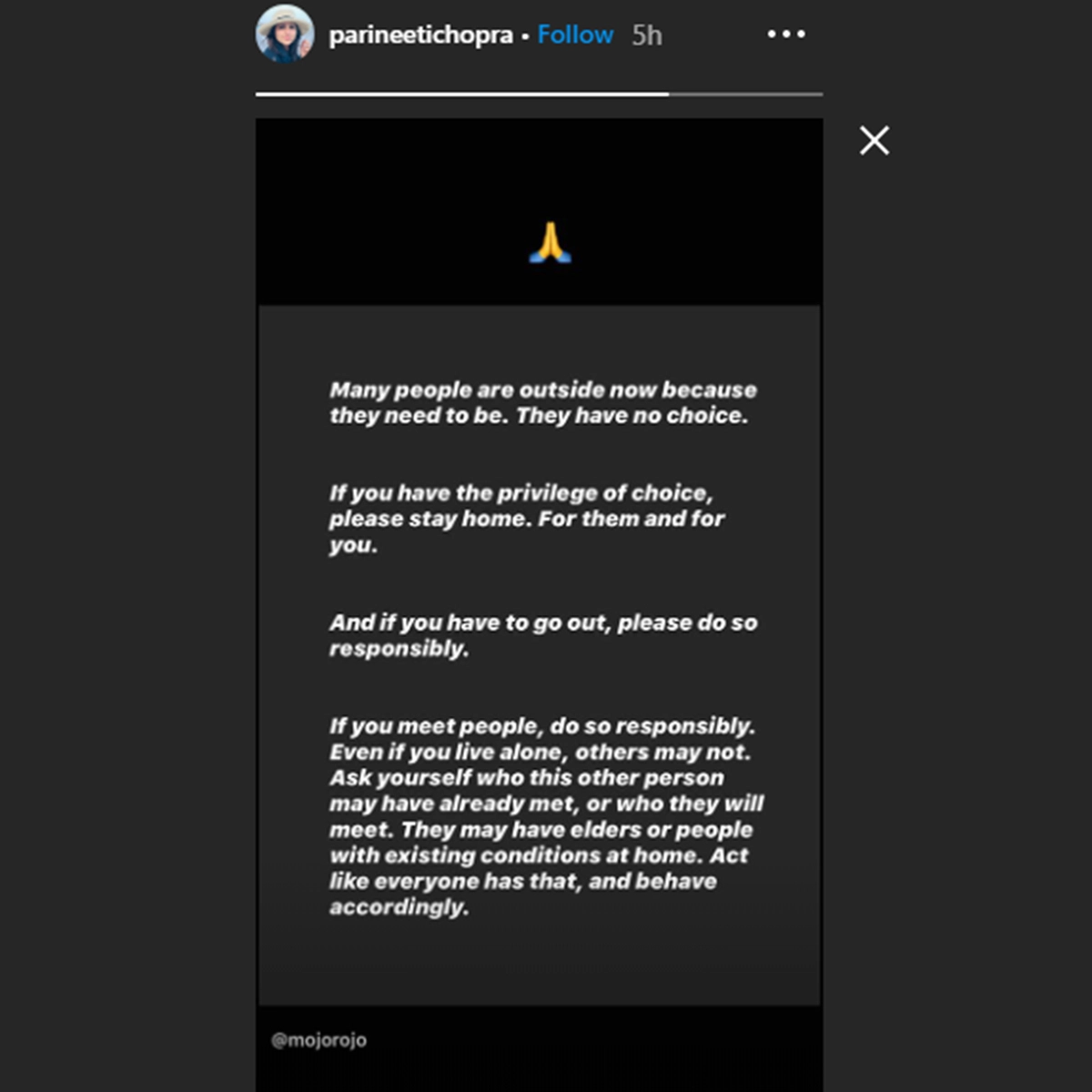 Actress Parineeti Chopra on Tuesday took to Instagram and urged people to step out responsibly, with strictures of the nationwide lockdown being relaxed even as the COVID-19 pandemic continues to escalate all over India. "Many people are outside now because they need to be. They have no choice. If you have the privilege of choice, be home. For them and for you. And if you have to go out, please do so responsibly," Parineeti wrote on Instagram Story. Unlock 1: From Ranvir Shorey to Anubhav Sinha, B-Town Celebs Urge People to Be Cautious of COVID-19 and Step Out Only If Its an Urgency.