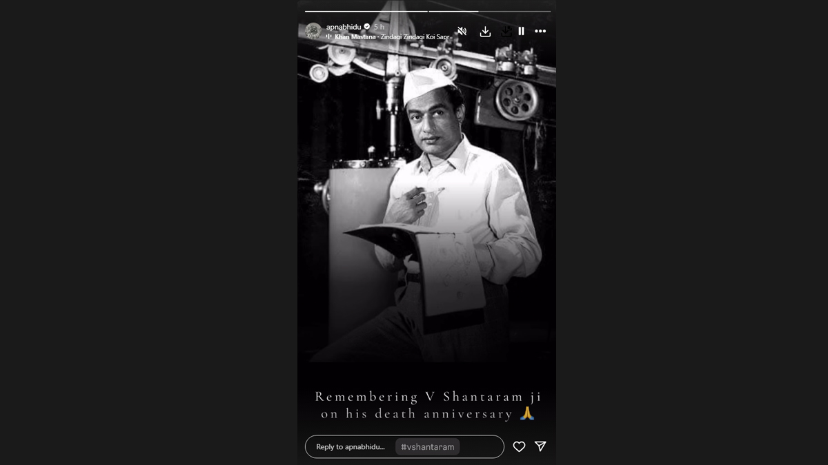 Jackie took to his Instagram stories, where he shared a monochrome picture of the late legendary filmmaker, who was fondly called as Shantaram Bapu. He also added the 1946 track Zindagi Zindagi Koi Sapna Nahi Zindagi by Khan Mastana.