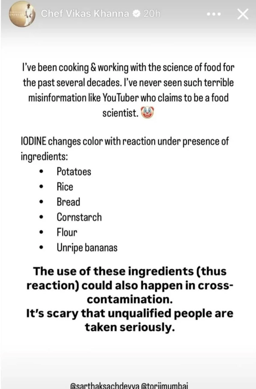 In an Instagram post, Michelin-starred chef Vikas Khanna, who shares a close relationship with the Khans, voiced strong concerns about the spread of food-related misinformation, particularly from self-proclaimed “food scientists” on platforms like YouTube. Khanna stated that he had never witnessed such alarming inaccuracies before. Regarding the YouTuber’s iodine test, he pointed out that iodine changes colour upon contact with many common ingredients such as potatoes, rice, bread, cornflour, flour, and unripe bananas—none of which indicate adulteration.