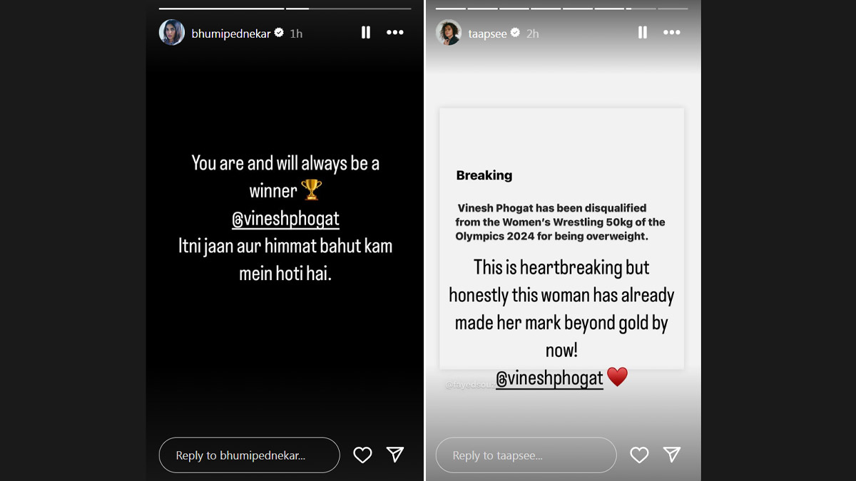 In the wake of the disqualification, the film fraternity has sent heartfelt messages to Phogat, offering words of encouragement and consolation. Actress Taapsee Pannu took to Instagram to express her support, writing, "This is heartbreaking but honestly this woman has already made her mark beyond gold by now! @vineshphogat." Vinesh Phogat Disqualified From Paris Olympics 2024: Congress MP Balwant Wankhede Alleges ‘Conspiracy’ Behind Indian Wrestler’s Disqualification Over Weight Issue, Says ‘Some People Might Not Have Liked Honouring Her’ (Watch Video).