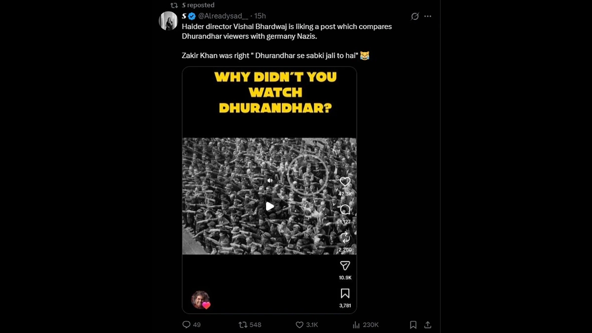 The controversy began when a viral screenshot circulated on X (formerly Twitter), showing Bhardwaj’s handle among those who liked a reel titled, “Why didn’t you watch Dhurandhar?” The reel featured the iconic historical photograph of August Landmesser, the lone man who refused to perform the Nazi salute in a 1936 crowd. By using this imagery, the content suggested that those who chose not to watch the film were akin to Landmesser, while the film's viewers were compared to the conforming masses of the Third Reich. The X user who shared the screenshot took a dig at the director, writing, “Haider director Vishal Bhardwaj is liking a post which compares Dhurandhar viewers with Germany Nazis. Zakir Khan was right, ‘Dhurandhar se sabki jali to hai’ (Everyone is jealous of Dhurandhar).”