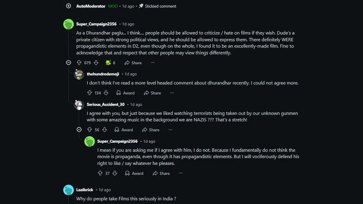 A single “like” has sparked a polarised debate online, with reactions ranging from outrage to strong defence. Critics, particularly fans of Dhurandhar 2, called the comparison a “cheap shot” at a record-breaking success that has drawn audiences back to theatres. Meanwhile, defenders on platforms like Reddit argued that Vishal Bhardwaj, known for his politically layered cinema, has the right to express personal opinions, with one user stating, “Dhurandhar 2 had some propagandistic bits, but overall, it’s a well-made film. Respecting different opinions is key.” Others took a lighter stance, questioning the intensity of the backlash, with one netizen asking, “Why do people take films this seriously in India?” ‘Dhurandhar 2’ OTT Release Date: Ranveer Singh’s INR 1,600 Crore Blockbuster To Stream on JioHotstar After IPL 2026.