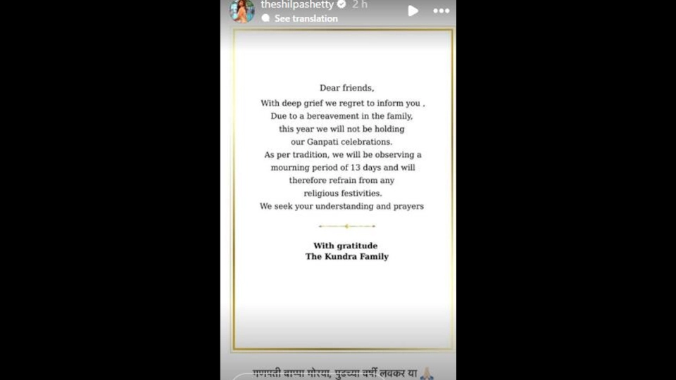The statement read: “Dear friends, With deep grief we regret to inform you, Due to a bereavement in the family, this year we will not be holding our Ganpati celebrations.” The actress said that she and her family will be observing a mourning period for 13 days. “As per tradition, we will be observing a mourning period of 13 days and will therefore refrain from any religious festivities. We seek your understanding and prayers. With gratitude – The Kundra Family,” she wrote. For the caption, Shilpa added: “Ganpati bappa morya, pudchyavarshi lav kar ya.”