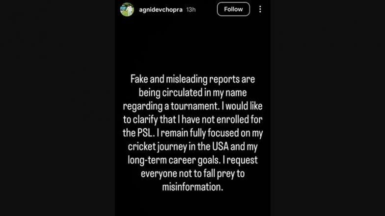 Chopra addressed the situation directly via an Instagram Story to set the record straight. "Fake and misleading reports are being circulated in my name regarding a tournament," he wrote. "I would like to clarify that I have not enrolled for the PSL. I remain fully focused on my cricket journey in the USA and my long-term career goals."
