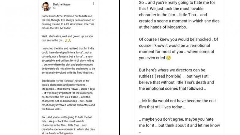 Apologising to fans for bringing down Tina, one of the most loved characters in the film, Kapur wrote, "So .. and you’re really going to hate me for this ! We just took the most lovable character in the film... little Tina... and created a scene a moment in which she dies at the hands of Mogambo. Of course, I knew you would be shocked. Of course I know it would be an emotional moment for most of you .. where some of you even cried. But here’s where we directors can be ruthless ( read horrible)... but hey! I still believe that without little Tina’s death and the emotional scenes that followed... Mr India would not have become the cult film that still lives today. Maybe you don’t agree, maybe you hate me for it .. but think about it and let me know."