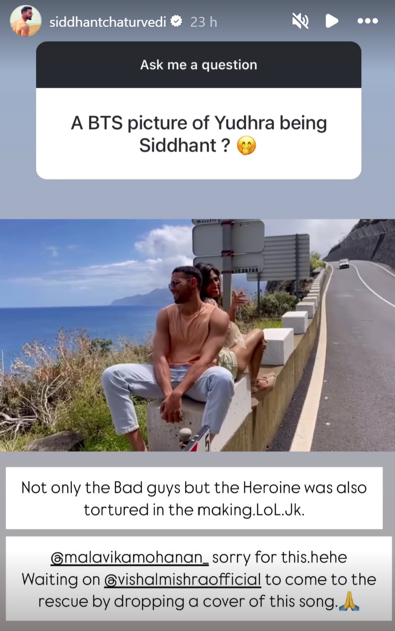 While giving a reply to it, Siddhant shared a video of him with his co-star Malavika, in which they can be seen enjoying the sets while crooning a song. He further wrote, "Not only the Bad guys but the Heroine was also tortured in the making.LoL.Jk. @malavikamohanan_ sorry for this.hehe Waiting on @vishalmishraofficial to come to the rescue by dropping a cover of this song."