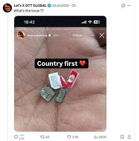 Ananya didn't do this—it's a photoshopped meme. The "Country first" IG story is fake, edited to troll cricket fans over Jio sponsoring SRH (owned by Kavya Maran). No real post from her, no news reports. Pure viral bait.