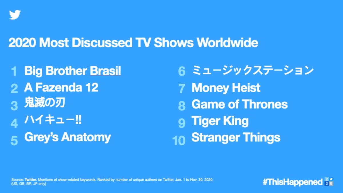 2020 Most Discussed TV Shows Worldwide include Grey's Anatomy, Money Heist and Game Of Thrones in fifth, seventh and eighth positions respectively.