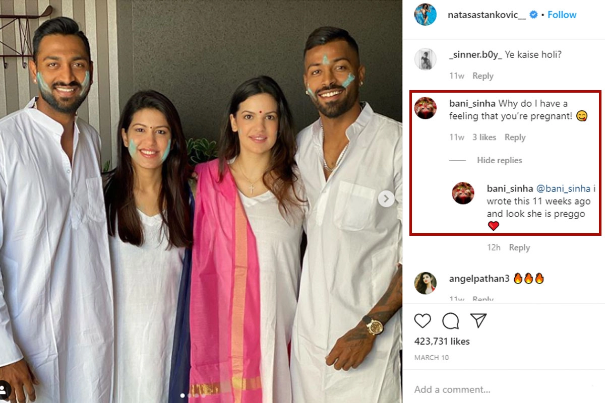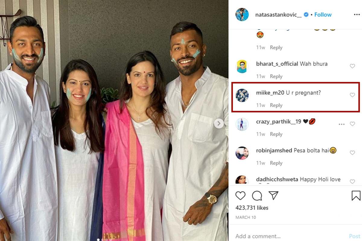 On the occasion of Holi this year, which was on March 10, celebs across industries had posted lovely family pictures and wished their fans. Even Hardik Pandya and Natasa Stankovic had shared a few family pictures and extended heartfelt greetings to their fans on the auspicious occasion. The couple was seen dressed in white, in traditional attires. Hardik’s fiancée looked stunning in a white, loosely fitted churidhar that she teamed up with a pink coloured dupatta. It was after seeing this picture that some of the fans guessed that she might be pregnant. Her posture and the loose garment made these fans doubt if she is expecting. Take a look at some of the comments shared by fans. Natasa Stankovic Pregnant With Hardik Pandya's First Child, Ex-Boyfriend Aly Goni Congratulates The Couple On Hearing Good News! (View Post).