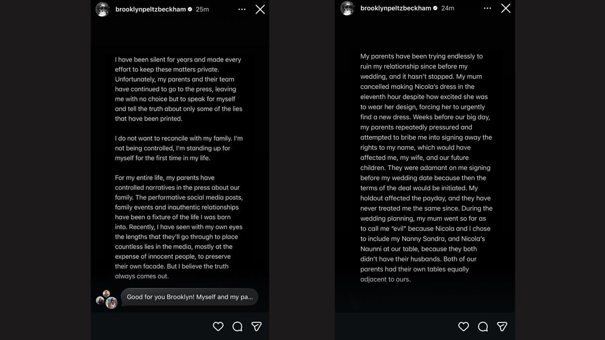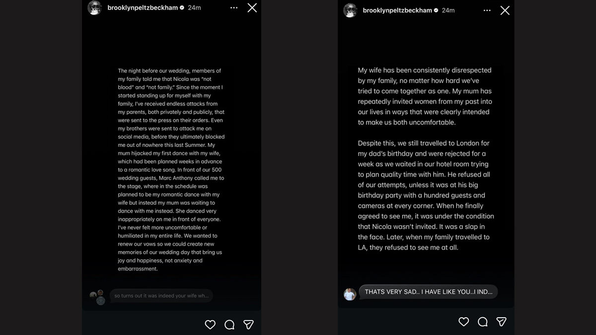 Reports emerged in December 2025 that Brooklyn had blocked his parents and siblings Romeo, Cruz and Harper on social media. His brother Cruz later confirmed the development, stating that the family “woke up blocked.” As of now, David and Victoria Beckham have not issued a formal response to Brooklyn’s claims. Concluding his posts, Brooklyn said he and Nicola want a life away from public image pressures. “My wife and I do not want a life shaped by image, press, or manipulation,” he wrote. “All we want is peace, privacy, and happiness for us and our future family.” The statements have sparked widespread discussion online, with fans and media closely watching whether the Beckham family will publicly respond.