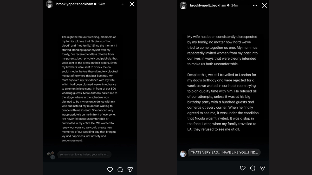 Brooklyn stated that tensions escalated around his 2022 wedding to actress Nicola Peltz in Palm Beach. According to his posts, the wedding became a turning point that led to a permanent rift. He alleged that weeks before the ceremony, his parents pressured and “attempted to bribe” him to sign away rights to his name, which he said could have impacted his future children. Brooklyn also supported Nicola’s long-standing claim that Victoria Beckham cancelled the production of her custom wedding gown at the “eleventh hour,” forcing the bride to find an alternative outfit close to the wedding date. In another allegation, Brooklyn claimed that Victoria “hijacked” his planned first dance with Nicola by dancing “inappropriately” with him in front of guests, leaving him feeling “humiliated.” WATCH: Brooklyn Beckham and Nicola Peltz Tie the Knot in Palm Beach, Florida - Latest Tweet by Reuters.